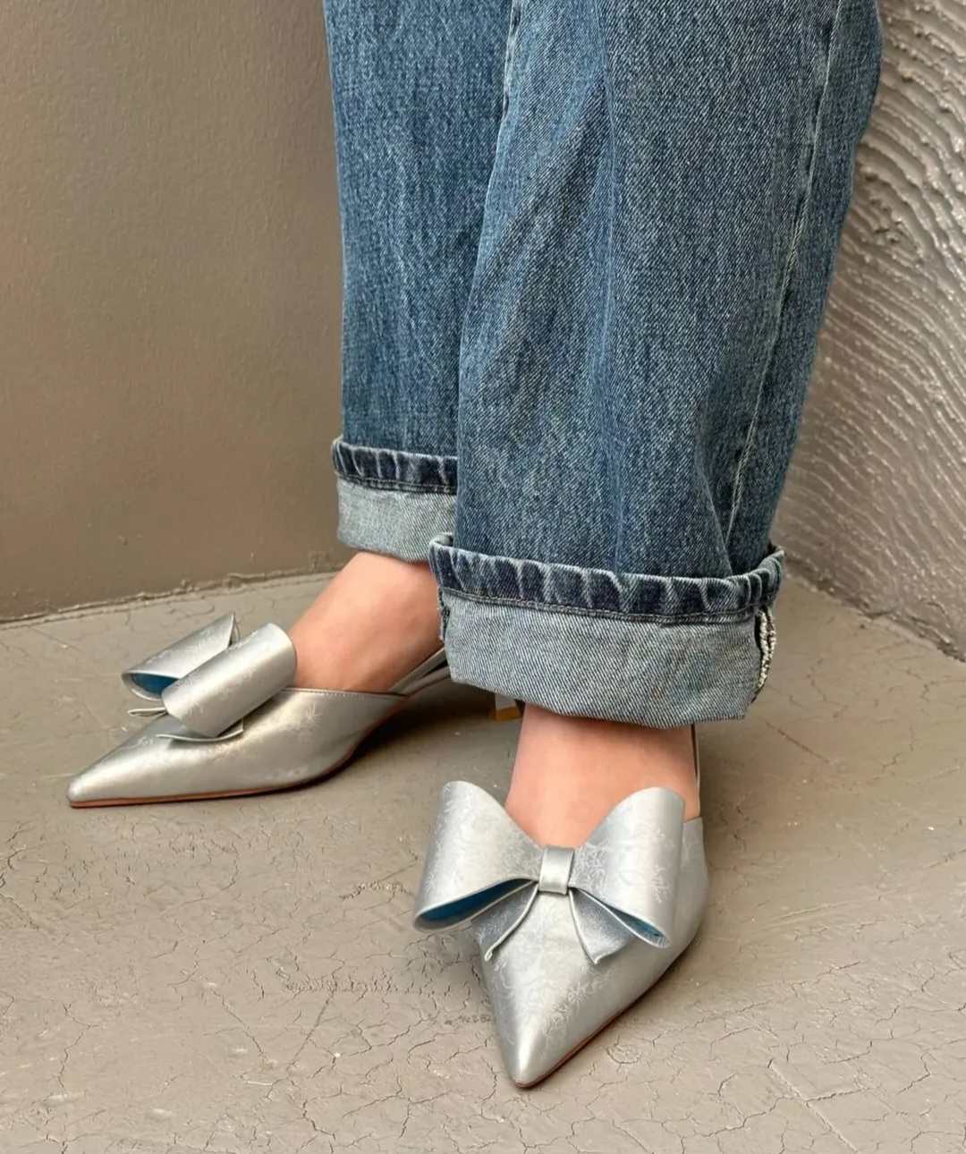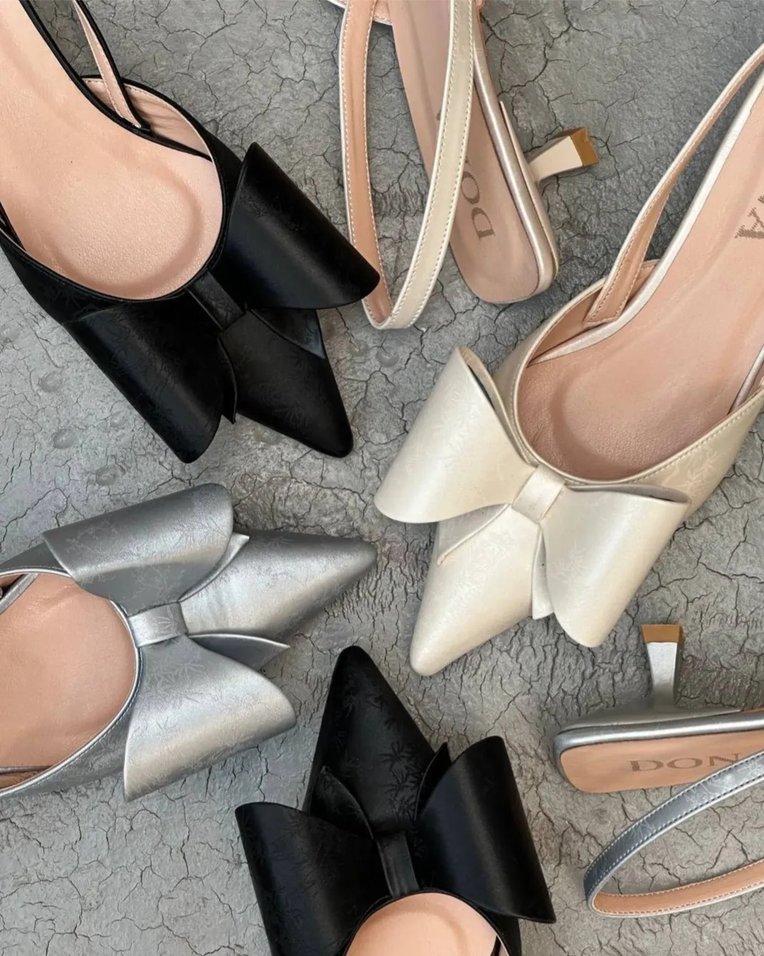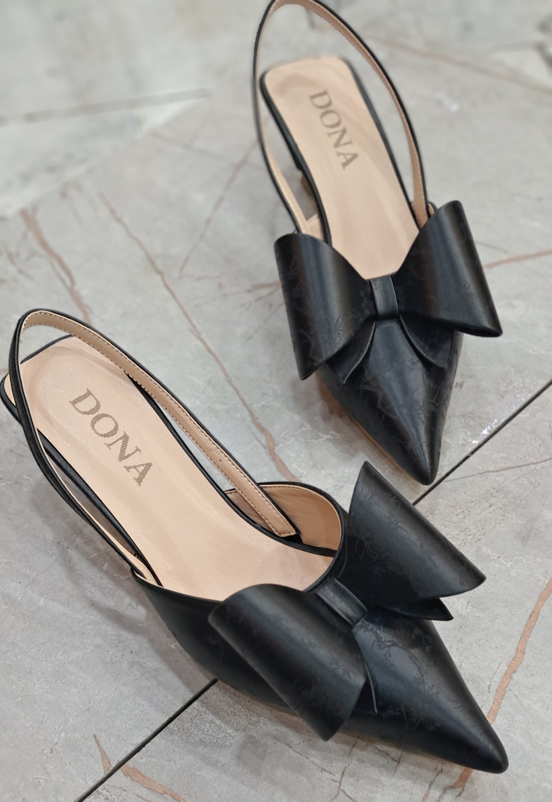 کفش پاپیون طلقی جنس ساتن خارجی طرحدار پاشنه ۴سانت سایز۳۷تا۴۰ رنگبندی تک رنگ مشکی زیره داووس ضمانت تعویض سایز